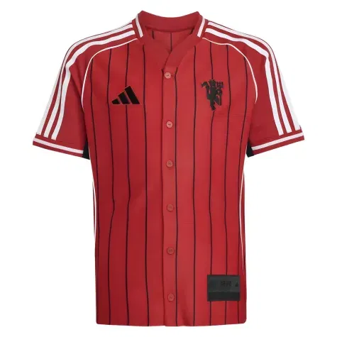 Baseball-Inspired Design This isn't your ordinary football shirt! Featuring a classic baseball-style button closure and striking pinstripes, this unique jersey is designed to make young United fans stand out from the crowd, whether they're cheering from the Stretford End or exploring Manchester city centre.