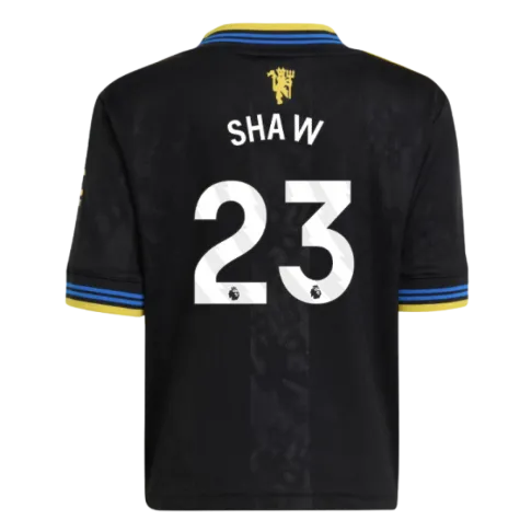 Official Luke Shaw football shirt. This is the NEW Manchester United Third Mini Kit for the 2025-2026 season which is manufactured by Adidas and is available in all Childrens sizes.