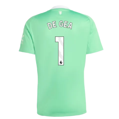 Official David De Gea football shirt. This is the NEW Man Utd Third Goalkeeper Shirt (Green) for the 2025-2026 season which is manufactured by Adidas and is available in all Adult sizes.