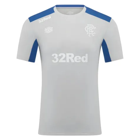 The shirt features a modern colourway with a sophisticated light grey base complemented by bold blue accents on the shoulders, sides, and collar trim. The classic Rangers crest sits proudly on the chest alongside the Umbro diamond logo, whilst the clean back design maintains the sleek aesthetic.