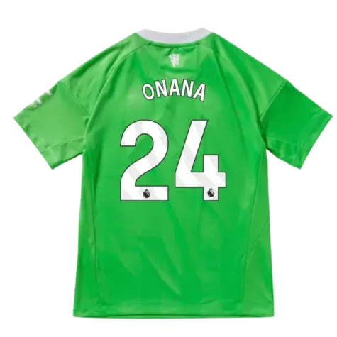 Official Andre Onana football shirt. This is the NEW Man Utd Third Goalkeeper Shirt (Green) - Kids for the 2025-2026 season which is manufactured by Adidas and is available in all Childrens sizes.