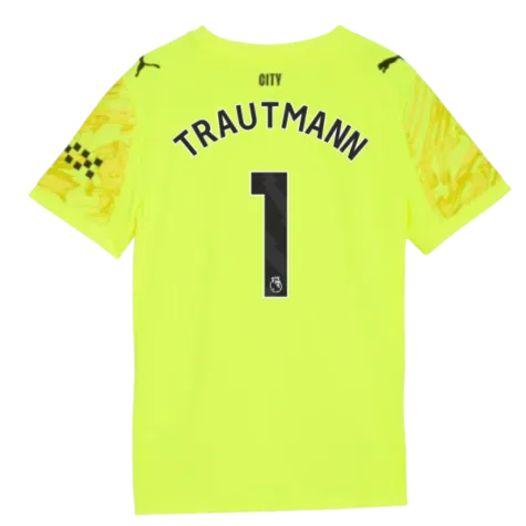 Official Bert Trautmann football shirt. This is the NEW Man City Goalkeeper Third Shirt (Yellow) - Kids for the 2025-2026 season which is manufactured by Puma and is available in all Childrens sizes.