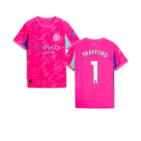Official James Trafford football shirt. This is the NEW Man City Goalkeeper Home Shirt (Pink) - Kids for the 2025-2026 season which is manufactured by Puma and is available in all Childrens sizes.