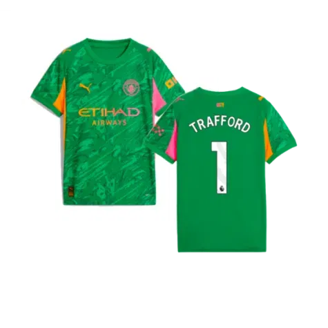 Official James Trafford football shirt. This is the NEW Man City Goalkeeper Away Shirt (Green) - Kids for the 2025-2026 season which is manufactured by Puma and is available in all Childrens sizes.