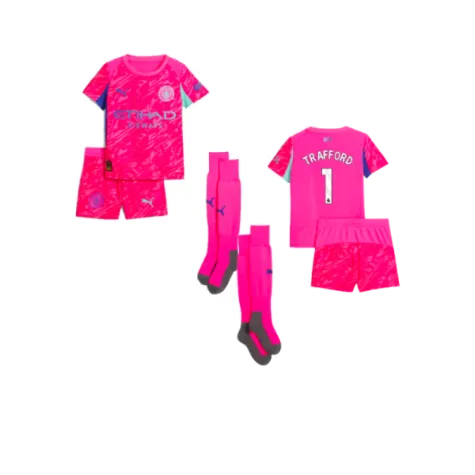 Official James Trafford football shirt. This is the NEW Man City Home Goalkeeper Mini Kit (Pink) for the 2025-2026 season which is manufactured by Puma and is available in all Childrens sizes.