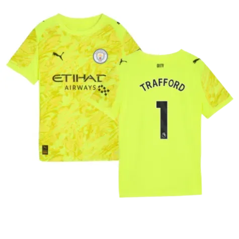 Official James Trafford football shirt. This is the NEW Man City Goalkeeper Third Shirt (Yellow) - Kids for the 2025-2026 season which is manufactured by Puma and is available in all Childrens sizes.