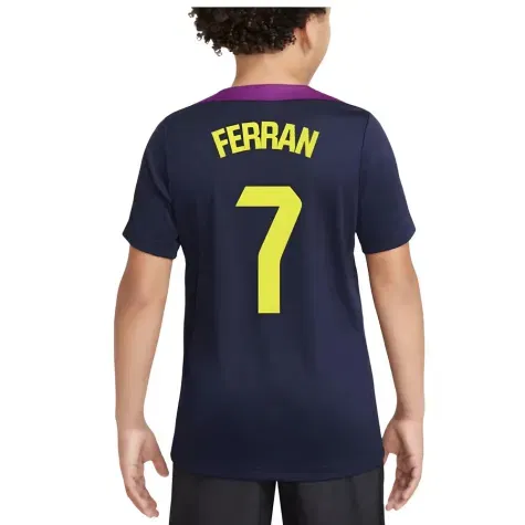 Official Ferran Torres football shirt. This is the NEW Barcelona Strike Training Shirt (Purple) - Kids for the 2025-2026 season which is manufactured by Nike and is available in all Childrens sizes.