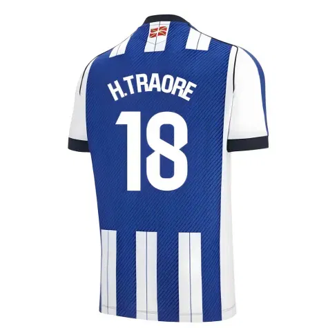 Official Hamari Traore football shirt. This is the NEW Real Sociedad Home Shirt for the 2025-2026 season which is manufactured by Macron and is available in all Adult sizes.