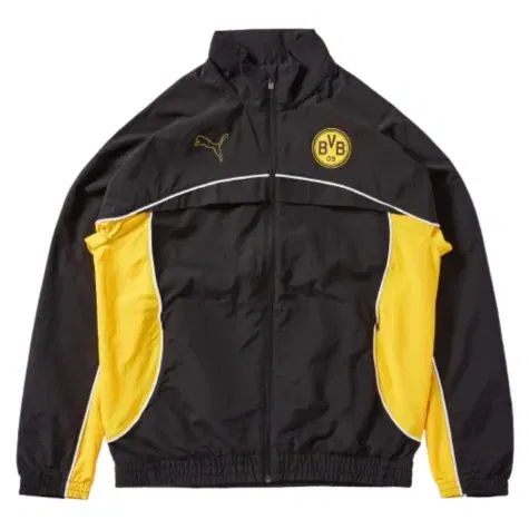 The jacket showcases Dortmund's legendary black and yellow colourway in a contemporary design that's both bold and sophisticated. The dominant black base is beautifully contrasted by vibrant yellow side panels and sleeves, creating a dynamic silhouette that embodies the club's electric atmosphere at Signal Iduna Park.