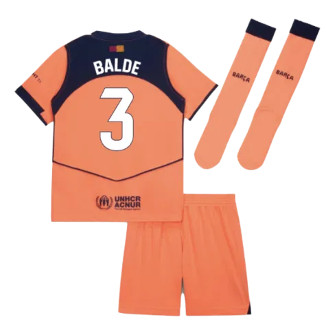Official Alejandro Balde football shirt. This is the NEW Barcelona Third Mini Kit for the 2025-2026 season which is manufactured by Nike and is available in all Childrens sizes.