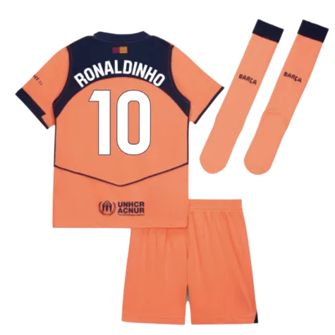 Official Ronaldinho football shirt. This is the NEW Barcelona Third Mini Kit for the 2025-2026 season which is manufactured by Nike and is available in all Childrens sizes.