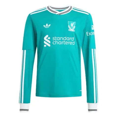 Give your young Liverpool supporter the ultimate expression of their Red pride with this stunning official Adidas youth third long sleeve jersey for the 2025-26 season. In the eye-catching sea green colorway that pays homage to Liverpool's legendary 1990s kits, this jersey is perfect for young fans ready to follow in the footsteps of their Anfield heroes.