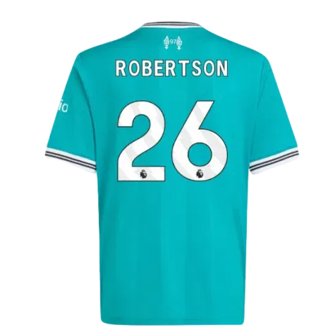 Official Andrew Robertson football shirt. This is the NEW Liverpool Third Shirt (Kids) for the 2025-2026 season which is manufactured by Adidas and is available in all Childrens sizes.