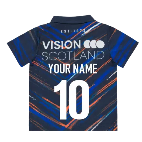Edinburgh Rugby 2025/26 Kids Home Replica Shirt. 2025/26 home kids shirt - Navy infants shirt with white, orange and blue chevron pattern, v-neck fold over collar with club crest placed over the heart.