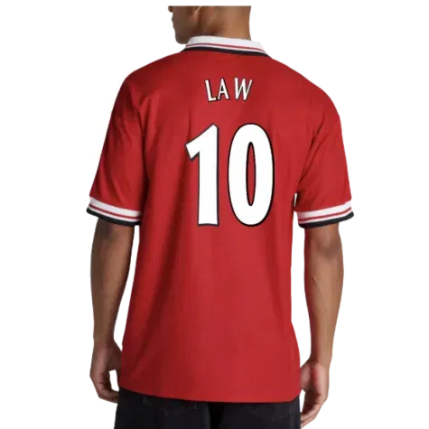 Official Law, Denis football shirt. This is the NEW Man Utd Retro Home Shirt for the 1998-2000 seasons which is manufactured by Score Draw and is available in all Adult sizes.
