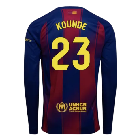 Official Jules Kounde football shirt. This is the NEW Barcelona Home Long Sleeve Shirt for the 2025-2026 season which is manufactured by Nike and is available in all Adult sizes.