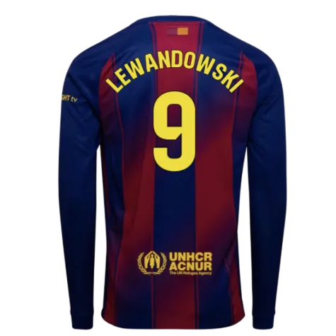 Official Robert Lewandowski football shirt. This is the NEW Barcelona Home Long Sleeve Shirt for the 2025-2026 season which is manufactured by Nike and is available in all Adult sizes.