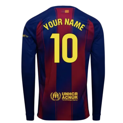 Official Your Name football shirt. This is the NEW Barcelona Home Long Sleeve Shirt for the 2025-2026 season which is manufactured by Nike and is available in all Adult sizes.