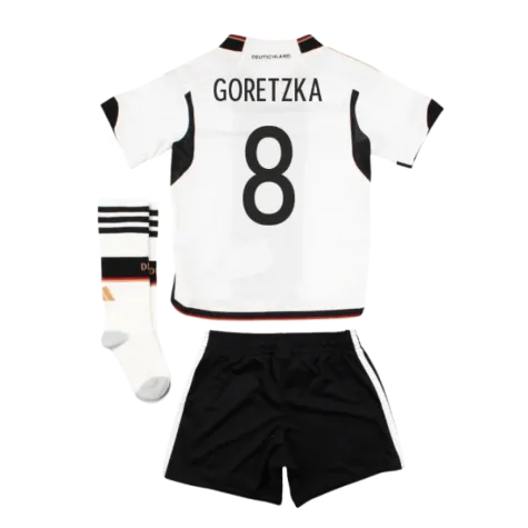 Official Leon Goretzka football shirt. This is the NEW Germany Home Mini Kit for the 2022-2023 season which is manufactured by Adidas and is available in all Childrens sizes.