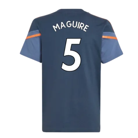 Official Harry Maguire football shirt. This is the NEW Man Utd Training Tee (Crew Navy) - Kids for the 2022-2023 season which is manufactured by Adidas and is available in all Childrens sizes.