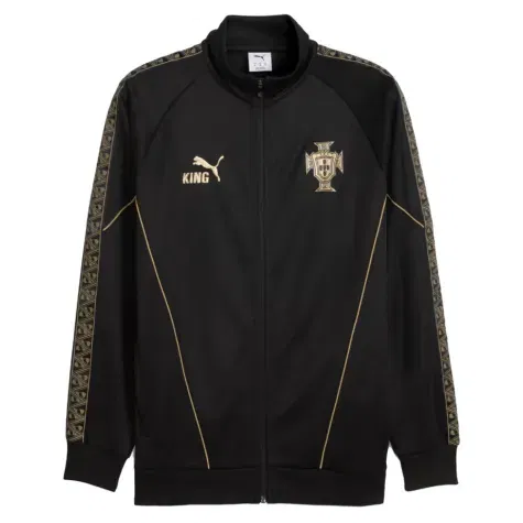 Part of Puma's premium SE KING range, this anthem jacket elevates traditional match-day wear to new heights. The striking black colourway provides a versatile foundation, enhanced by Portugal's iconic crest embroidered proudly on the chest. Puma's signature branding adds the finishing touch to this sleek, modern design that works just as well on the terraces as it does on the streets.