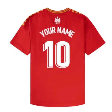 Crafted in striking red with fine gold pinstripes, the SD Ibiza Home Jersey is a tribute to the islands unique blend of heritage and energy. The shirt features a bespoke tonal illustration of Ibizas iconic Dalt Vila a UNESCO World Heritage site capturing the whitewashed houses, terracotta rooftops, and stone walls cascading towards the Mediterranean.