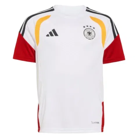 Crafted from Adidas's signature moisture-wicking fabric, this training jersey keeps young players cool and comfortable whether they're practising skills in the garden or supporting Die Mannschaft on match day. The clean white colourway is accented with the classic black, red, and gold Germany colours, whilst the famous Adidas three stripes add that unmistakable sporty aesthetic.