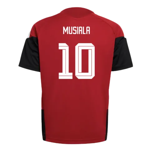 Official Jamal Musiala football shirt. This is the NEW Germany Training Jersey (Red) - Kids for the 2026-2027 season which is manufactured by Adidas and is available in all Childrens sizes.