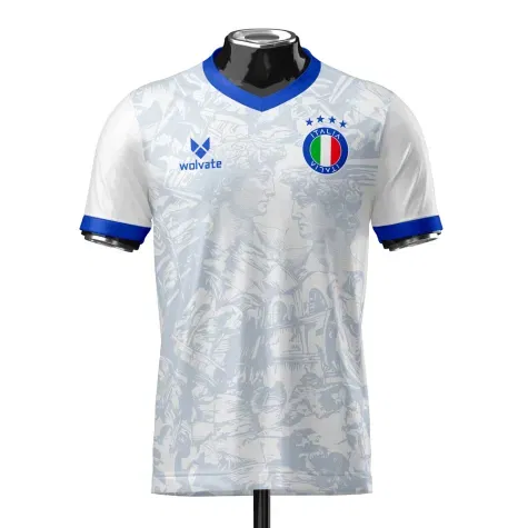 The Italy Heritage Football Jersey by Wolvate brings together classic Azzurri pride and modern athletic design, offering a striking tribute to Italys rich football tradition. Presented in a bold deep-blue colorway, the jersey features a refined textured pattern across the body that adds depth and sophistication while subtly nodding to iconic Italian style. A sleek V-neck collar and clean white-trimmed sleeves create a crisp, contemporary silhouette, complemented by the contrasting Wolvate logo and Italy-inspired crest that deliver a sharp, distinguished finish. Crafted from lightweight, breathable performance fabric, the jersey provides all-day comfort whether youre training, celebrating match day, or incorporating it into your everyday wardrobe, making it the perfect choice for fans who want to showcase their Italian football passion with elegance and confidence.