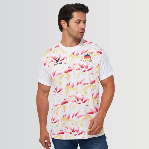 The Germany Tribute Football Jersey Wolvate brings bold energy and national pride together in a standout design made for true supporters. Featuring a vibrant fusion of red, gold, and white in a striking abstract pattern, this jersey delivers a modern artistic twist while honoring Germanys iconic colors. Crafted from lightweight, breathable, and fast-drying performance fabric, it keeps you comfortable whether youre training, cheering, or styling it casually. Finished with the premium Wolvate logo and a detailed Germany crest, this jersey combines athletic functionality with eye-catching styleperfect for fans who want a fresh and expressive tribute piece.