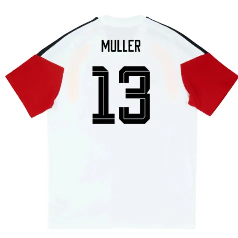 Official Thomas Muller football shirt. This is the NEW Germany Training Tee (White) for the 2026-2027 season which is manufactured by Adidas and is available in all Adult sizes.