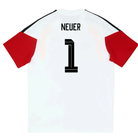 Official Manuel Neuer football shirt. This is the NEW Germany Training Tee (White) - Kids for the 2026-2027 season which is manufactured by Adidas and is available in all Childrens sizes.