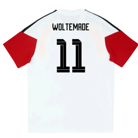 Official Nick Woltemade football shirt. This is the NEW Germany Training Tee (White) - Kids for the 2026-2027 season which is manufactured by Adidas and is available in all Childrens sizes.