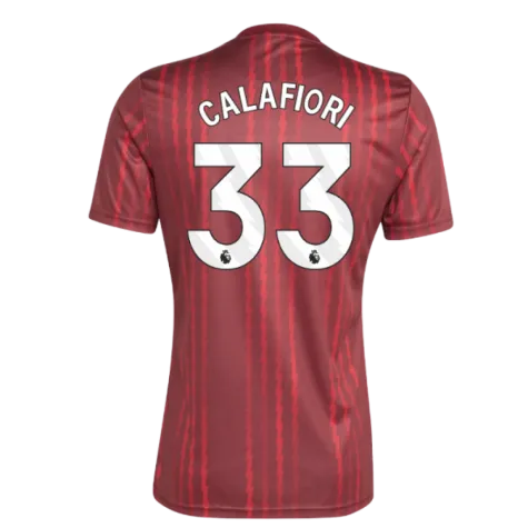 Official Riccardo Calafiori football shirt. This is the NEW Arsenal Pre-Match Warm Up Shirt (Burgundy) for the 2025-2026 season which is manufactured by Adidas and is available in all Adult sizes.