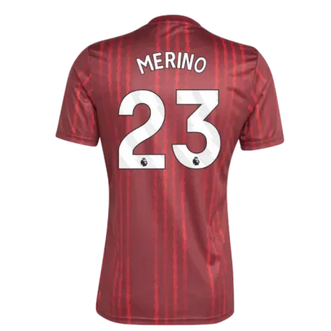 Official Mikel Merino football shirt. This is the NEW Arsenal Pre-Match Warm Up Shirt (Burgundy) for the 2025-2026 season which is manufactured by Adidas and is available in all Adult sizes.