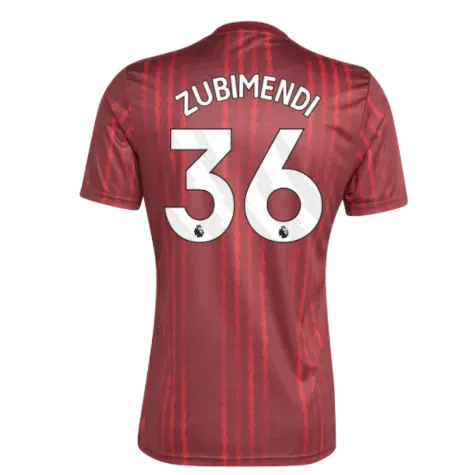 Official Martn Zubimendi football shirt. This is the NEW Arsenal Pre-Match Warm Up Shirt (Burgundy) for the 2025-2026 season which is manufactured by Adidas and is available in all Adult sizes.