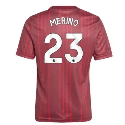 Official Mikel Merino football shirt. This is the NEW Arsenal Pre-Match Warm Up Shirt (Burgundy) - Kids for the 2025-2026 season which is manufactured by Adidas and is available in all Childrens sizes.