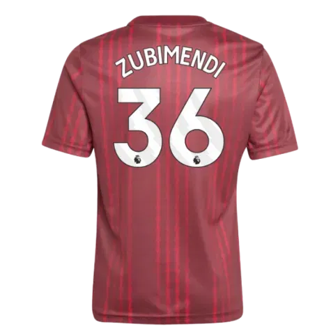 Official Martn Zubimendi football shirt. This is the NEW Arsenal Pre-Match Warm Up Shirt (Burgundy) - Kids for the 2025-2026 season which is manufactured by Adidas and is available in all Childrens sizes.