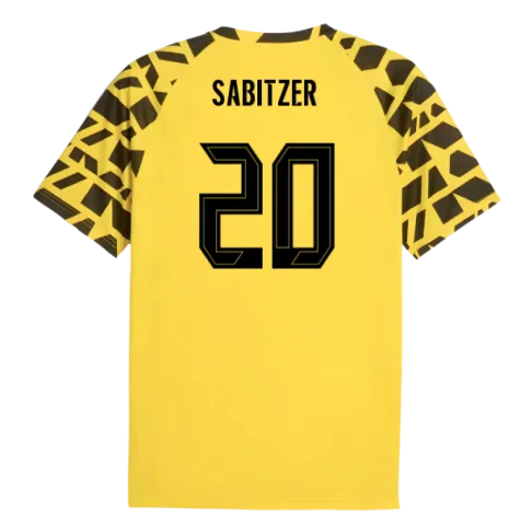 Official Marcel Sabitzer football shirt. This is the NEW Borussia Dortmund Warm Up Jersey (Yellow) for the 2025-2026 season which is manufactured by Puma and is available in all Adult sizes.