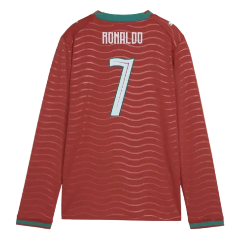 Official Cristiano Ronaldo football shirt. This is the NEW Portugal Long Sleeve Home Shirt (Kids) for the 2026-2027 season which is manufactured by Puma and is available in all Childrens sizes.