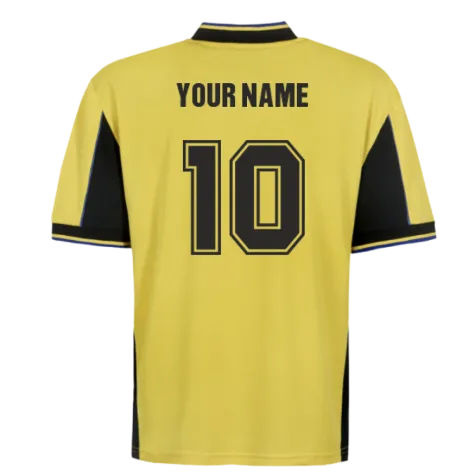 This authentic retro replica features the striking bright yellow colourway with bold navy and blue trim that made this away kit instantly recognisable. The eye-catching design includes distinctive black side panels and sleeves, complemented by navy and yellow striped detailing on the collar and cuffs a classic 90s football aesthetic that stands the test of time.