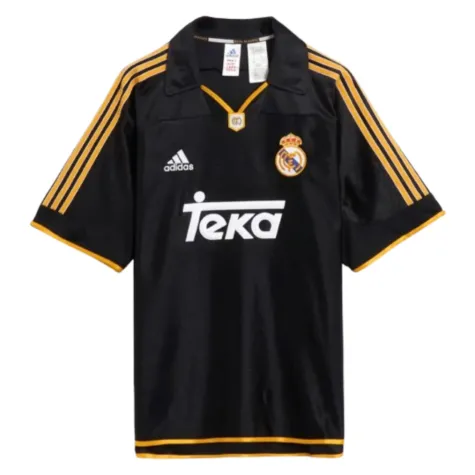 Own a piece of Real Madrid history with this iconic 1999-00 away shirt. Dressed in a striking black colourway with bold gold Adidas stripes and trim, this kit represents one of the most successful periods in Los Blancos' illustrious history.