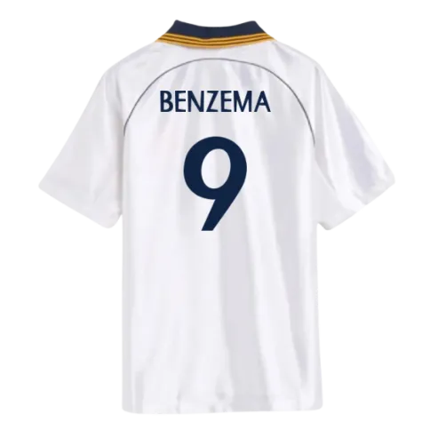 Official Karim Benzema football shirt. This is the NEW Real Madrid Reissue Home Shirt for the 1998-2000 season which is manufactured by Adidas and is available in all Adult sizes.