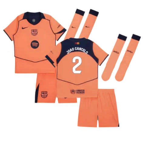 Official Joao Cancelo football shirt. This is the NEW Barcelona Third Mini Kit for the 2025-2026 season which is manufactured by Nike and is available in all Childrens sizes.