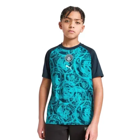 Let young City fans train and support their club in authentic style with the Manchester City Big Kids Warm-Up Jersey from PUMA, featuring a striking Deep Navy base contrasted with vibrant Tropical Blue detailing. Inspired by the kit worn by the players during pre-match preparations, this jersey delivers performance comfort with unmistakable club identity.
