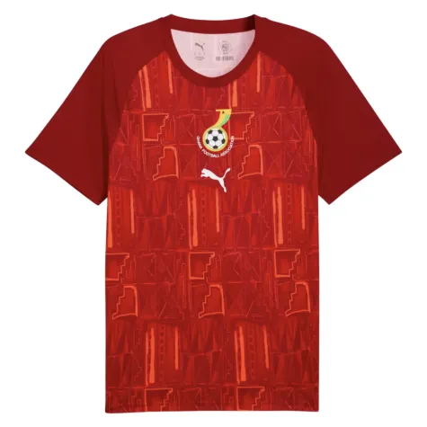 Solid Dark Crimson raglan sleeves provide a clean contrast to the patterned body, while the official Ghana Football Association badge and iconic Puma logo sit proudly on the chest. The crew neck design and relaxed raglan cut deliver unrestricted movement - perfect for the warm-up pitch or everyday wear.