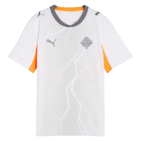 Kitted out and ready to roar introduce your little Viking to the official Iceland 2026 Puma Away Shirt. Striking in white with bold orange side panels and a grey V-neck collar, this eye-catching kit is as bold as Iceland's reputation on the world stage.