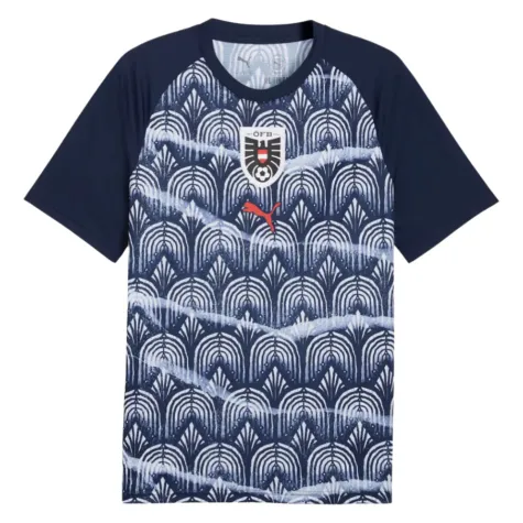 Stand out before kick-off with the official Austria 2026 Puma Warm-Up Jersey. This eye-catching pre-match top features a bold all-over Art Nouveau-inspired fan print across the body and back, set against a deep navy blue base with contrast solid navy raglan sleeves - a design that's as distinctive off the pitch as it is on it.