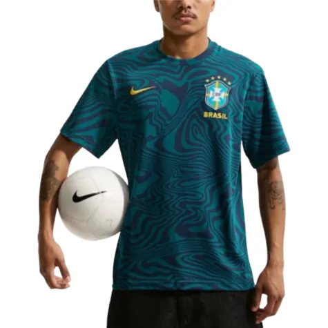 The deep Geode Teal base is brought to life by an all-over fluid wave graphic - a swirling, organic pattern that flows across the front and back in a darker navy tone, giving the shirt a striking, contemporary feel. The official CBF Brasil crest sits on the chest, complete with the five-star arrangement above it, finished in eye-catching gold - a nod to Brazil's unmatched World Cup pedigree. A matching gold Nike Swoosh completes the look on the opposite chest.