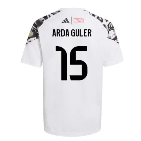 Official Arda Guler football shirt. This is the NEW Real Madrid Marvel Avengers Training Shirt (White) - Kids for the 2025-2026 season which is manufactured by Adidas and is available in all Childrens sizes.